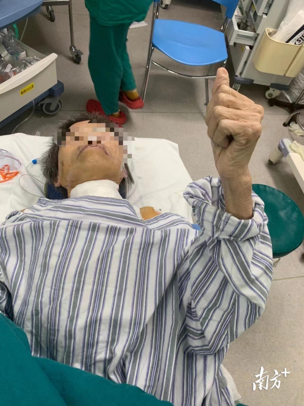 非插管食管癌切除术后,病人为手术团队竖起大拇指。 受访者供图